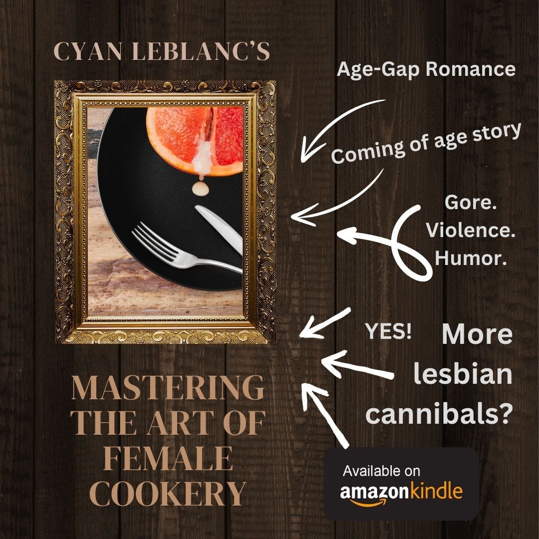 It is part fictional memoir and part humorous cookbook (please do not attempt these recipes at home). The story starts with 7-year old Cora Sweeney watches her family be murdered at the hands and mouths of cannibal women. Over the years, her trauma leads her to learn she is one too. The Sapphic horror romance takes the reader on two-decade journey of self discovery, love, and relationships.